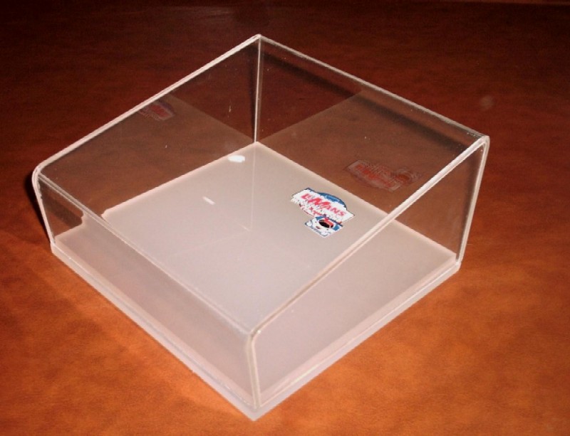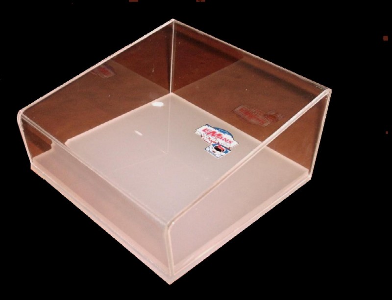 La nostra vetrinetta (antipolvere) è in plexi con bordi frontali arrotondati e laterali incollati con colla b/c trasparente (infatti non si nota assolutamente nulla) , la base con canali di appoggio è di un elegante lexan di colore bianco semitrasparente SATINATO dallo spessore di 1,00 cm. , quindi molto importante.