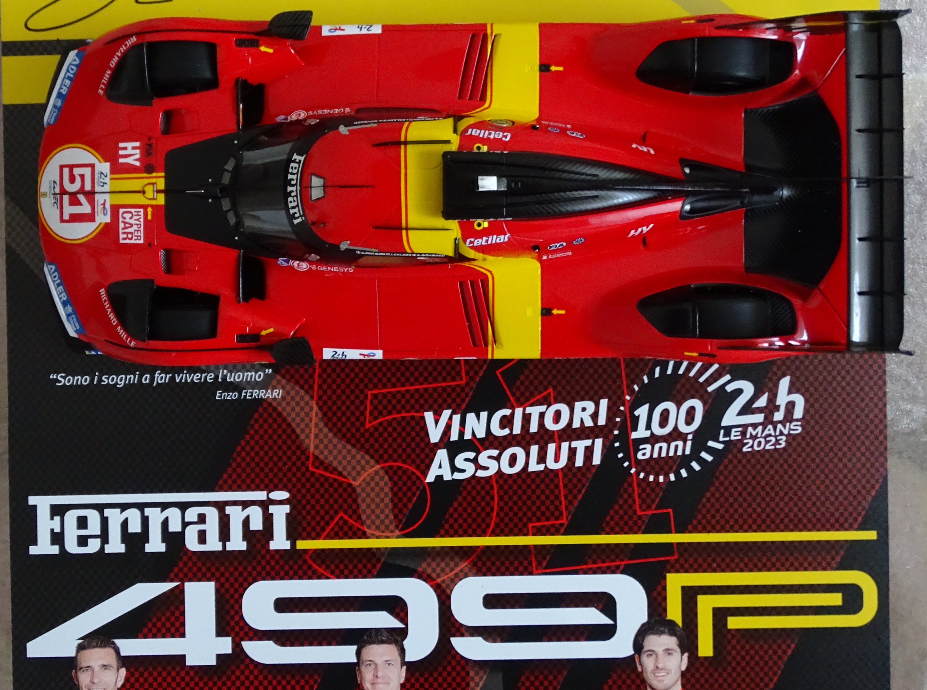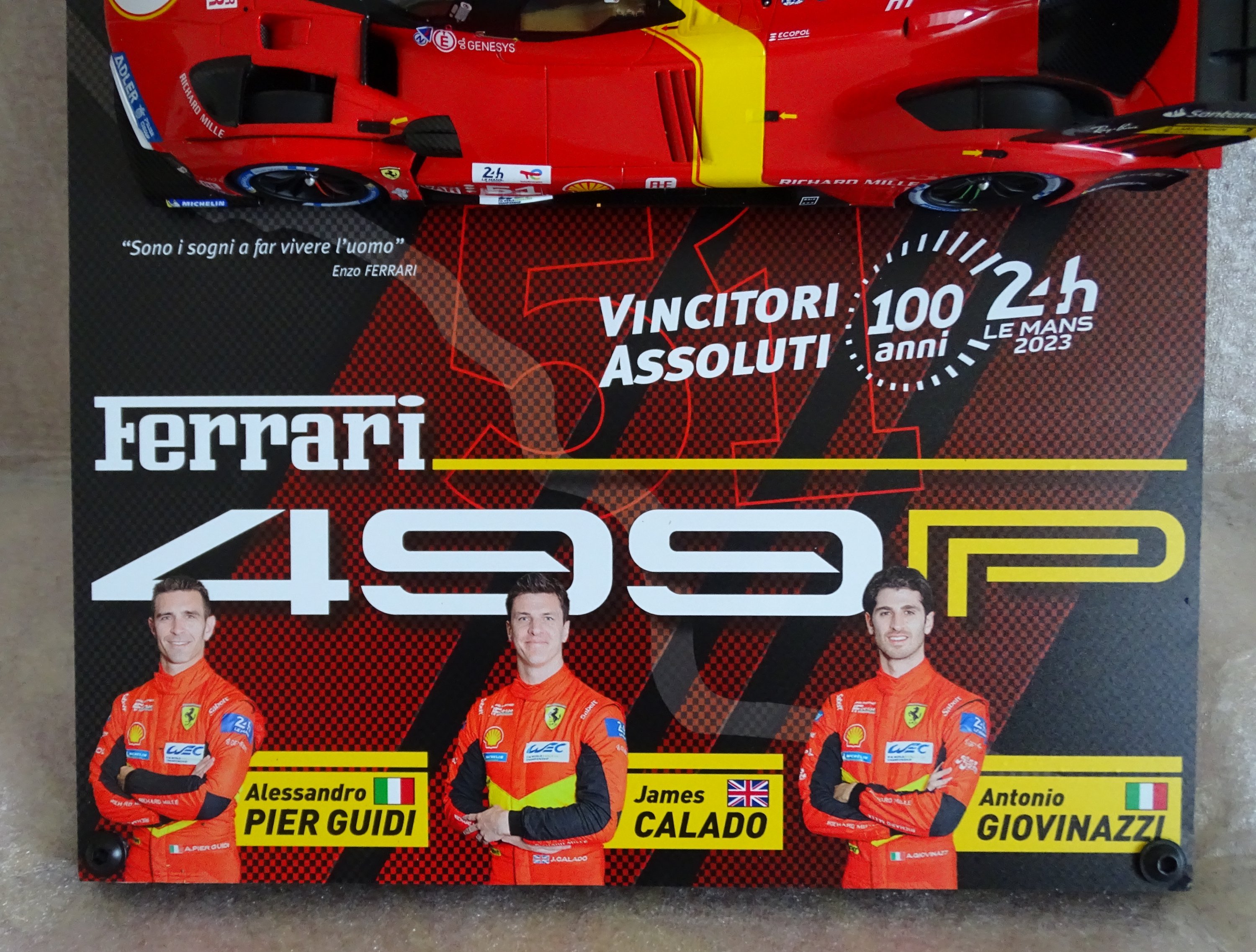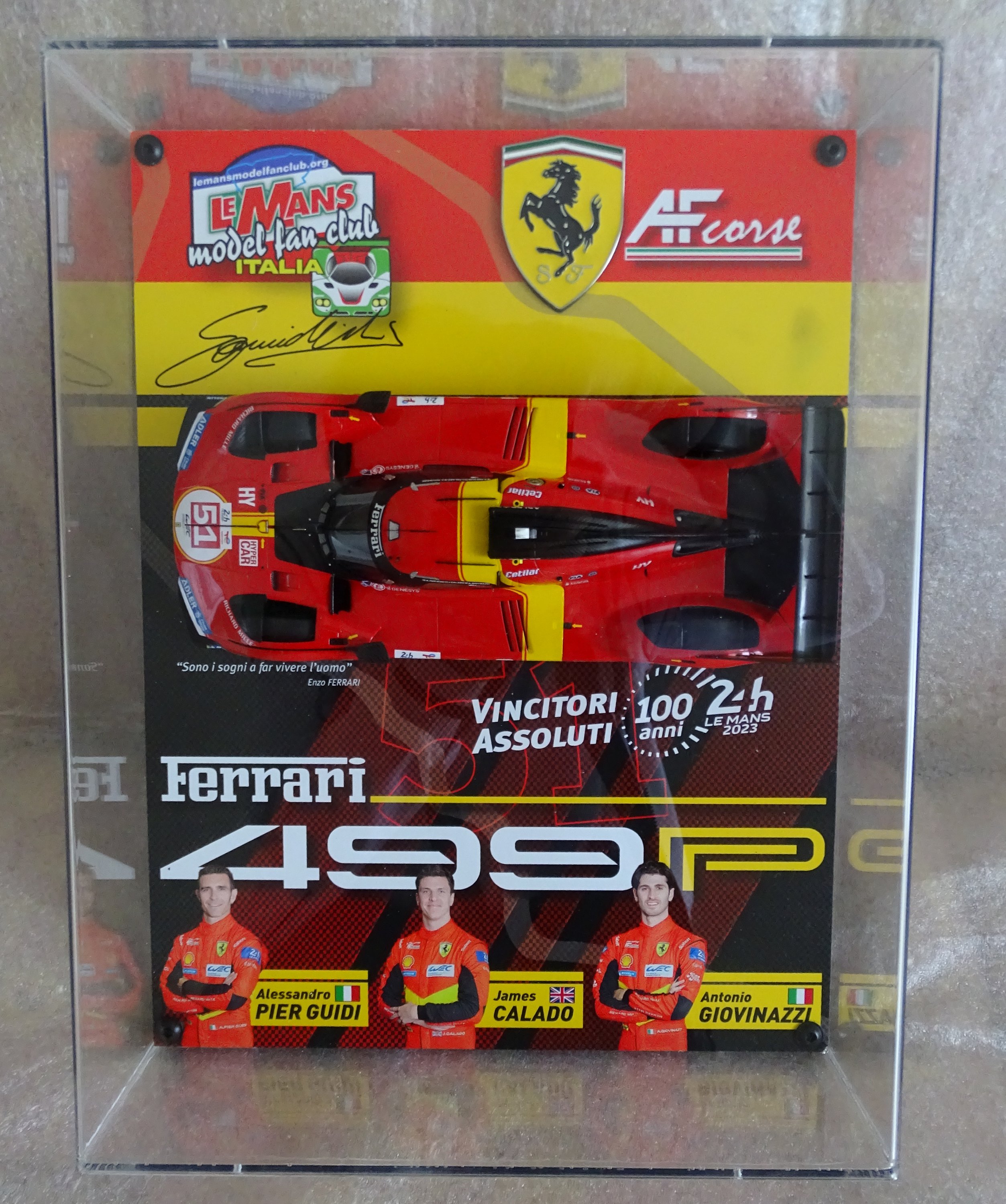 100 anni della 24 ore di LE MANS, ritorno in forma ufficiale del cavallino rampante in Endurance dopo tantissimi anni di assenza nella massima e nuova formula HYPERCAR con tante agguerrite case costruttrici in competizione, il successo WEC targato 2023, un equipaggio con tutte le carte in regola per fare bene, un Team che la dice lunga sulla gestione dei mezzi, una 24 ore di LE MANS strepitosa con Pole, giro veloce e VITTORIA. Questa la FERRARI 499P e nella fattispecie la #51, scrive la storia del Motorsport Internazionale e noi non potevamo che evidenziarlo alla nostra maniera, con un modello 1/18 in edizione limitata a 12pc in tutto il mondo e con le solite caratteristiche che si apprezzano nei modelli targati LE MANS MODEL FAN CLUB che a circa 30anni di attività e con un a miriade di altre pubblicazioni, con questo, il Presidente del Sodalizio Nicola Sandivasci lo “griffa” della sua firma a testimonianza di un’opera modellistica strepitosa